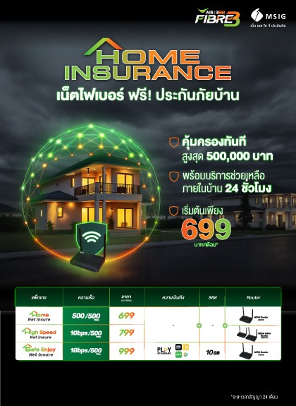 โปรโมชั่น 3BB AIS Fibre3 ประจำเดือนนี้ …. มีอินเทอร์เน็ตบ้านความเร็วสูงมาตรฐาน 1 Gbps พร้อมแพ็กเกจสุดคุ้มอย่าง Home Insurance ได้ทั้งเน็ตบ้าน ทั้งประกันบ้าน ประกันอุบัติเหตุ คุ้มครองทันที สูงสุด 500,000 บาท พร้อมบริการช่วยเหลือภายในบ้าน 24 ชั่วโมง เริ่มต้นเพียง 699 บาท/เดือน