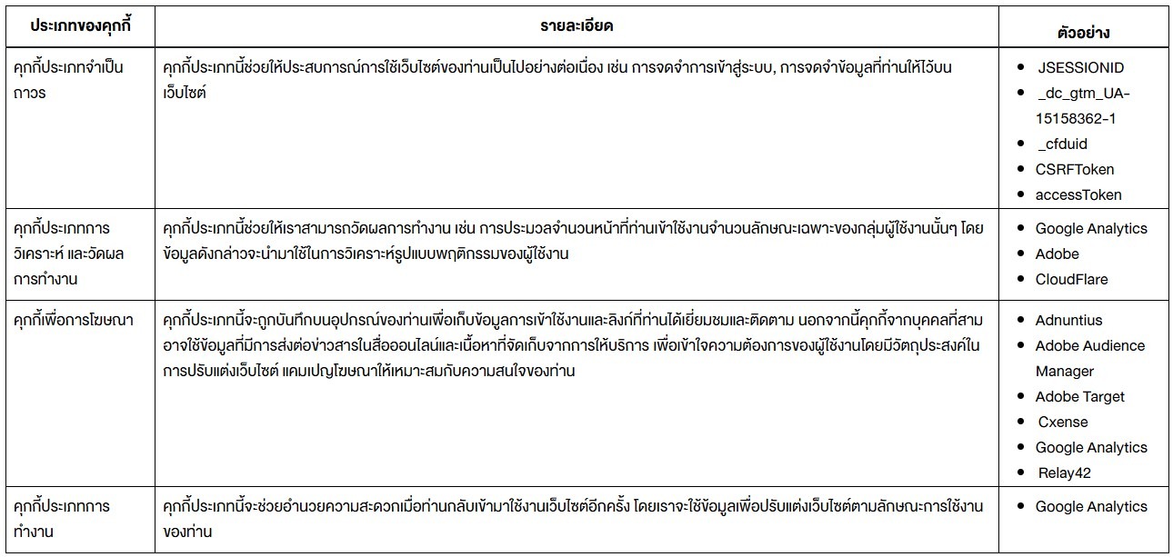 เราใช้คุกกี้เพื่อเพิ่มประสบการณ์และความพึงพอใจของท่าน โดยจะทำให้เราเข้าใจลักษณะการใช้งานเว็บไซต์ของท่านได้เร็ว และทำให้เว็บไซต์ของเราเข้าถึงได้ง่าย สะดวกยิ่งขึ้น บางกรณีเราจำเป็นต้องให้บุคคลที่สามดำเนินการ ซึ่งอาจจะต้องใช้ อินเตอร์เน็ตโปรโตคอลแอดเดรส (IP Address) และคุกกี้เพื่อวิเคราะห์ทางสถิติ ตลอดจนเชื่อมโยงข้อมูล และประมวลผลตามวัตถุประสงค์ทางการตลาด